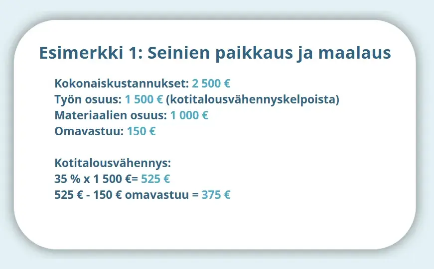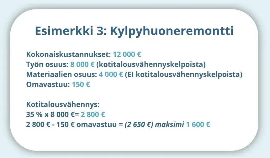Huom! Vähennys ei ole kotitalous- vaan henkilökohtainen, useampi samassa taloudessa asuva henkilö voi siis saada kotitalousvähennyksen niistä töistä, jotka on maksettu hänen varoistaan. Remonttia tilatessa on tärkeää, että laskut osoitetaan maksun suorittaneelle henkilölle, ellei kyseessä ole puoliso, jolloin maksaja voi olla kumpi tahansa osapuoli.